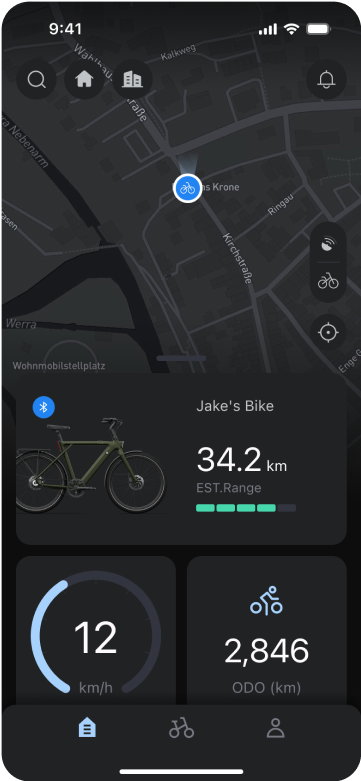 Das Smart Connect-Modul ist in den Rahmen integriert. Es liefert GPS-Tracking-Informationen und sendet dir Echtzeit-Benachrichtigungen über die TENWAYS-App, falls sich dein E-Bike unerwartet bewegt. Intelligente Funktionen für deine Sicherheit!